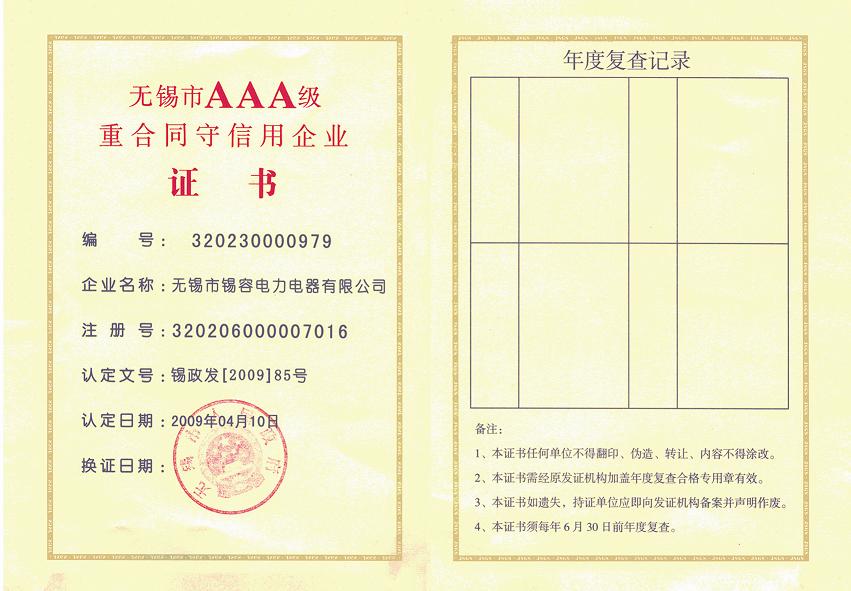 Wuxi Xirong Electric Appliance Co., Ltd. was awarded by Wuxi Technical Supervision and Information Research Institute in 2008 as a member unit of China Wuxi Quality Network